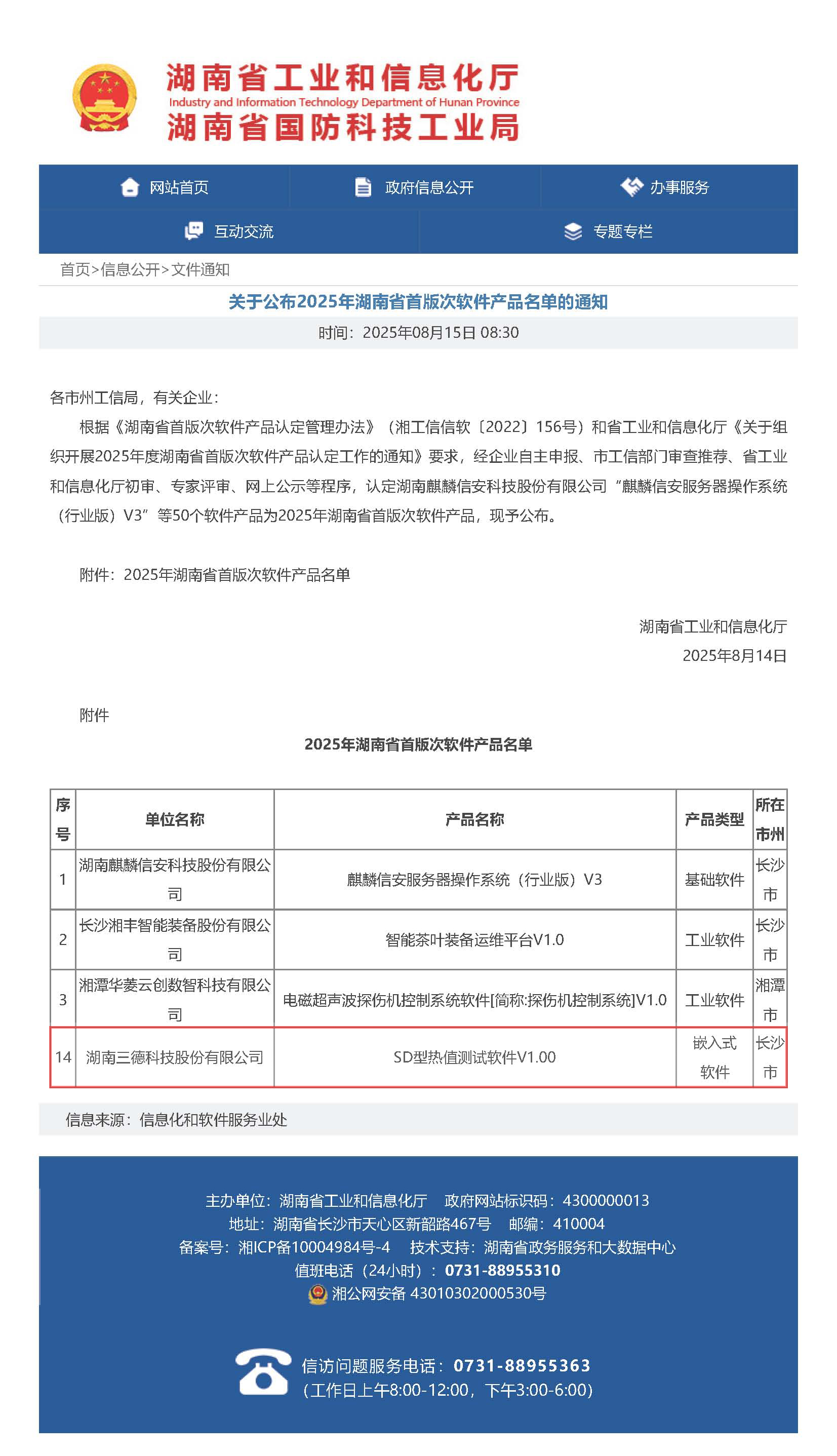 近日,湖南省工业和信息化厅公布《2025年湖南省首版次软件产品名单》,三德科技自主研发的“SD型热值测试软件V1.00”成功入选。